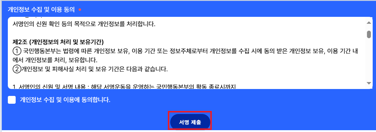 - 서명 양식을 작성한 후 "제출" 버튼을 클릭하세요.
