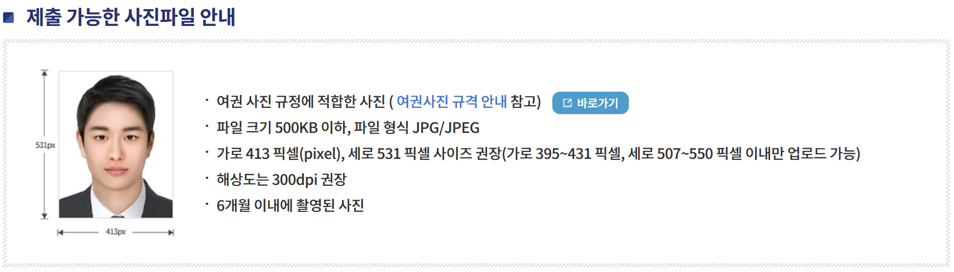- 여권용 사진(53x41mm, 200kb 이하, JPG 형식)을 업로드합니다.