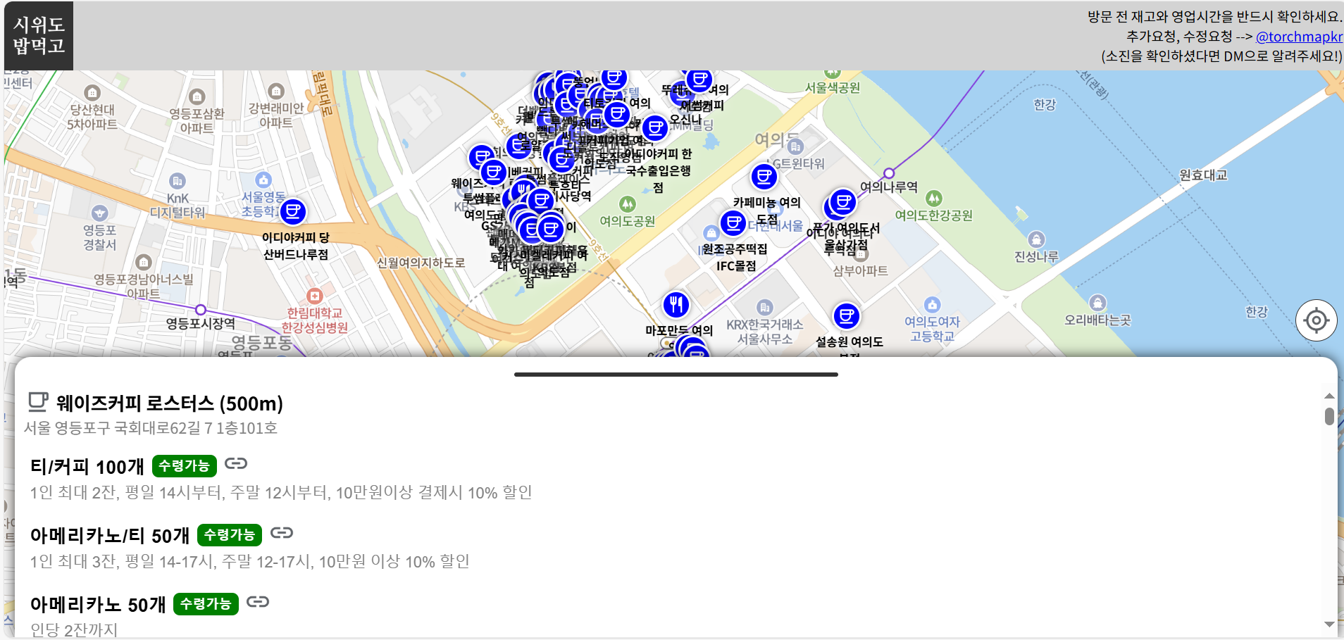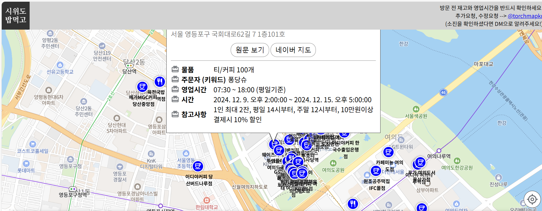 여의도 집회 참여자들을 위해 선결제 나눔 지도가 만들어졌습니다. 커피, 국밥, 분식, 푸드트럭 등 다양한 매장에서 나눔이 이루어지고 있으며, 이 정보를 통해 가까운 매장을 쉽게 찾을 수 있습니다.
