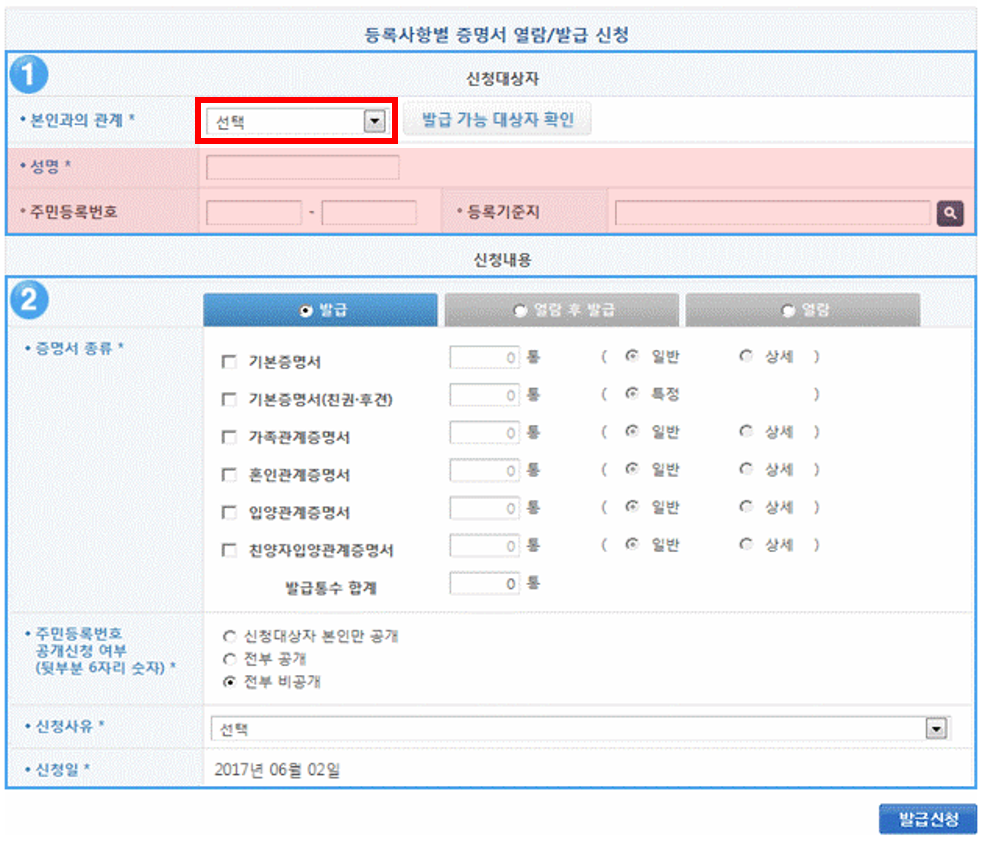 - 신청서 작성: 신청자의 관계, 개인 정보, 필요한 증명서 종류(기본증명서, 가족관계증명서 등)를 선택합니다.
