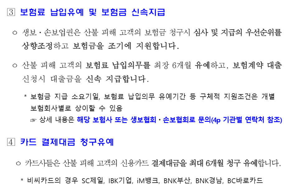 - 보험료 납입 유예 및 보험금 신속지급