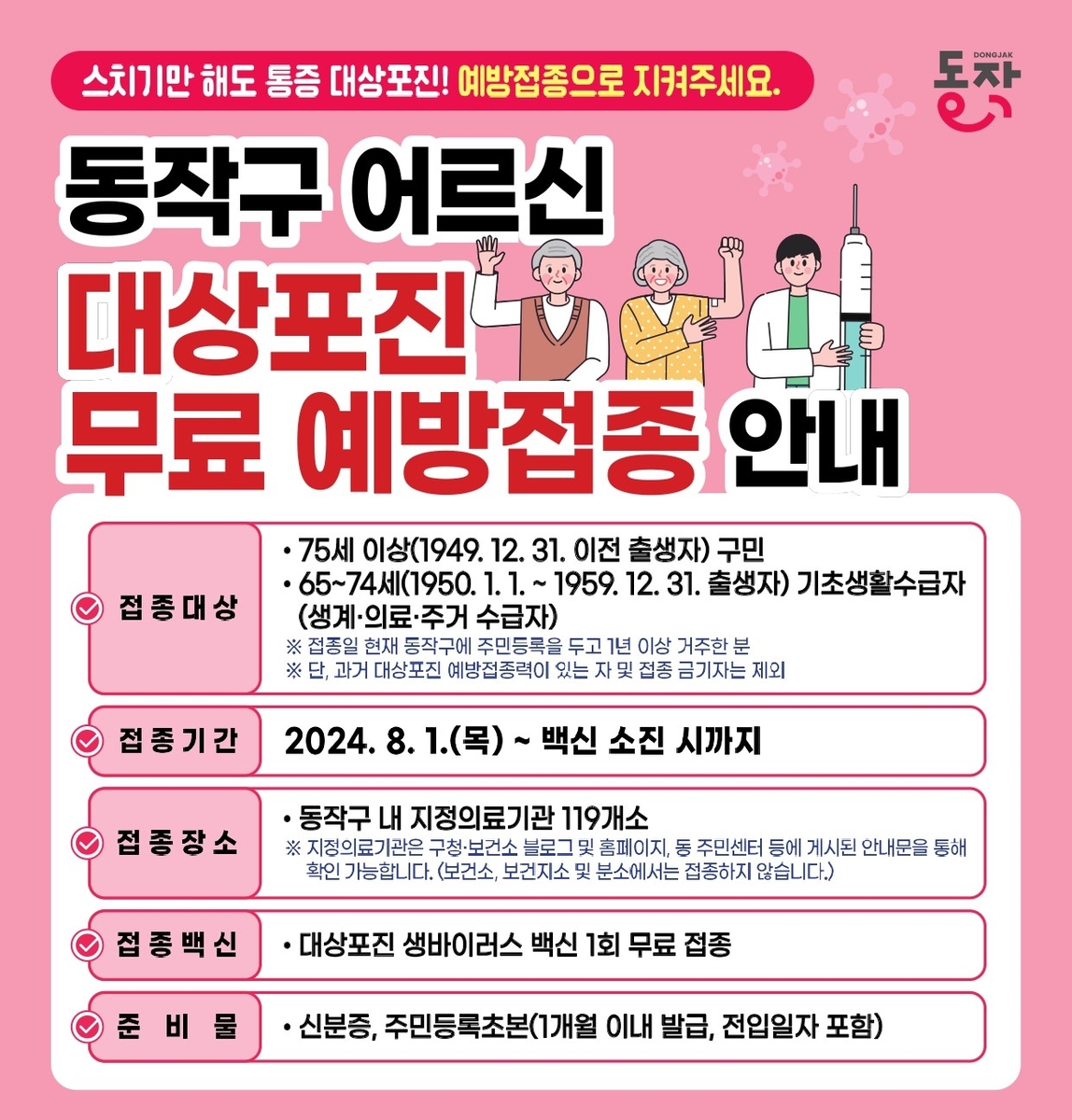 65세 이상 어르신들 중 만 나이 기준으로 접종이 가능합니다. 신청 시 본인임을 확인할 수 있는 신분증을 지참하여 거주지 보건소를 방문하면 무료 접종 혜택을 받을 수 있습니다. 지자체별로 정책이 다를 수 있으므로, 거주지 보건소나 복지로 웹사이트에서 무료 접종 대상 확인이 필요합니다.
