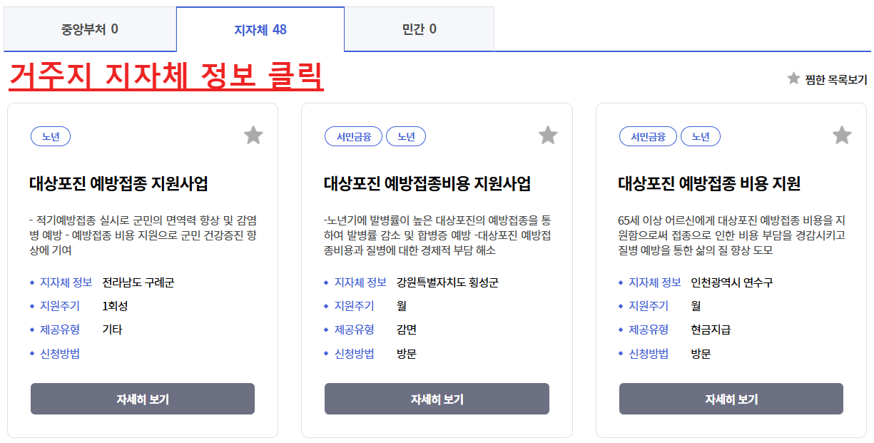 신청 전 지자체별로 대상포진 무료 접종 대상자 확인이 필요하며, 복지로 사이트에서 지자체 별로 검색이 가능하며 거주지에 무료 접종이 가능한지 확인하여야 합니다. 이후 필요한 준비물을 확인하여 절차가 원활히 진행될 수 있도록 합니다.
