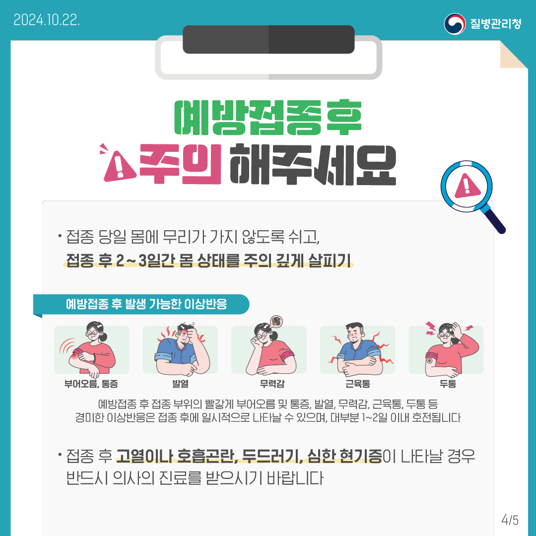 - 접종 부위가 아프거나 붓는 증상이 있을 수 있으니 과도한 운동은 피하는 것이 좋습니다.